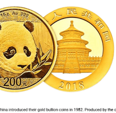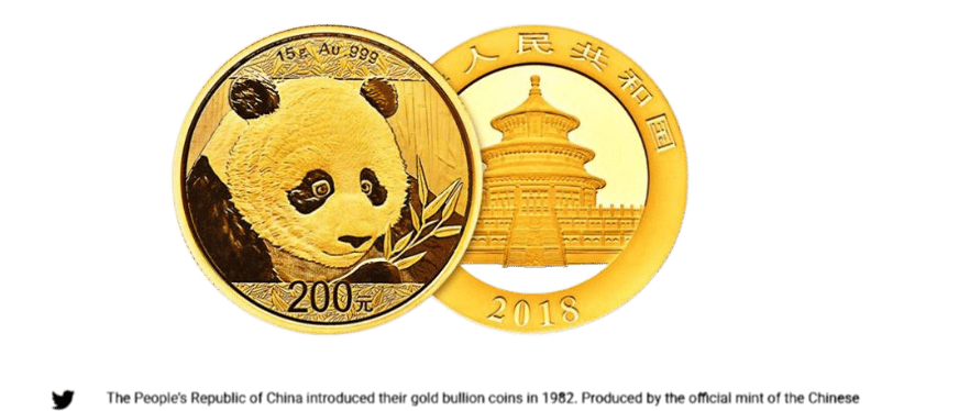 中华人民共和国于 1982 年发行了金币。该金币由中国政府官方造币厂铸造,被称为熊猫金币,共有五种尺寸,从 1/20 金衡盎司到 1 金衡盎司不等,24k 黄金纯度高达 0.999。